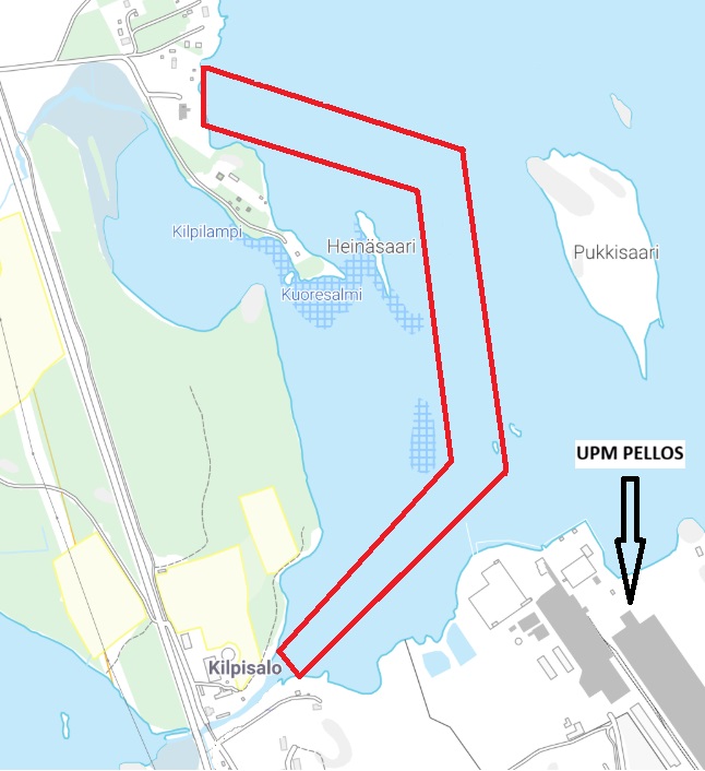 Liikkumista tulee välttää kuvan mukaisella työmaa-alueella heikon jään takia. Alue on merkitty jäällä oranssein aurausviitoin sekä kyltein.